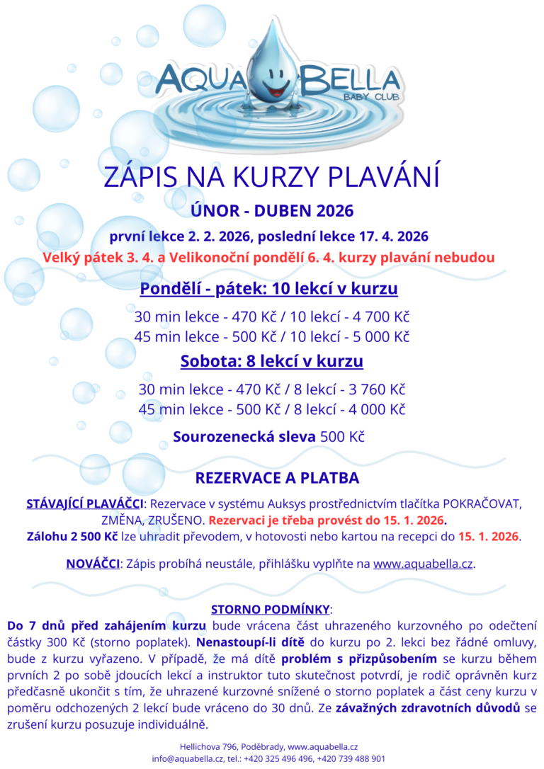 Velikonoční prázdniny: 3. 4. – 6. 4., neplaveme ani necvičíme