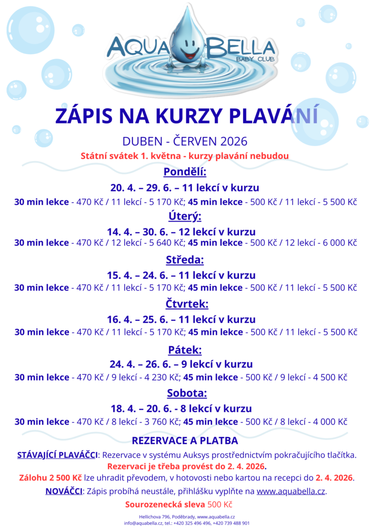 - Po konzultaci s rodiči si AquaBella Baby Club vyhrazuje právo na přesun dětí v jednotlivých skupinách.